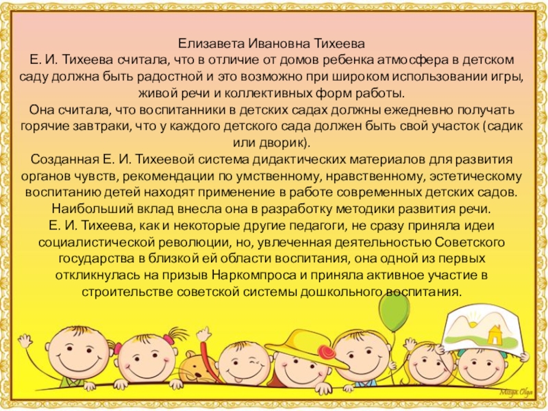Е. И. Тихеева, как и некоторые другие педагоги, не сразу приняла идеи социалистической революции, но, увлеченная деятельностью Советского государства в близкой ей области воспитания, она одной из первых откликнулась на призыв Наркомпроса и приняла активное участие в строительстве советской системы дошкольного воспитания.