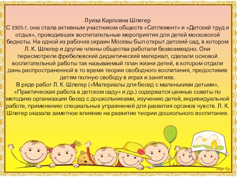 и «Детский труд и отдых», проводивших воспитательные мероприятия для детей московской бедноты. На одной из рабочих окраин Москвы был открыт детский сад, в котором Л. К. Шлегер и другие члены общества работали безвозмездно. Они пересмотрели фребелевский дидактический материал, сделали основой воспитательной работы так называемый план жизни детей, в котором отдали дань распространенной в то время теории свободного воспитания, предоставив детям полную свободу в играх и занятиях.