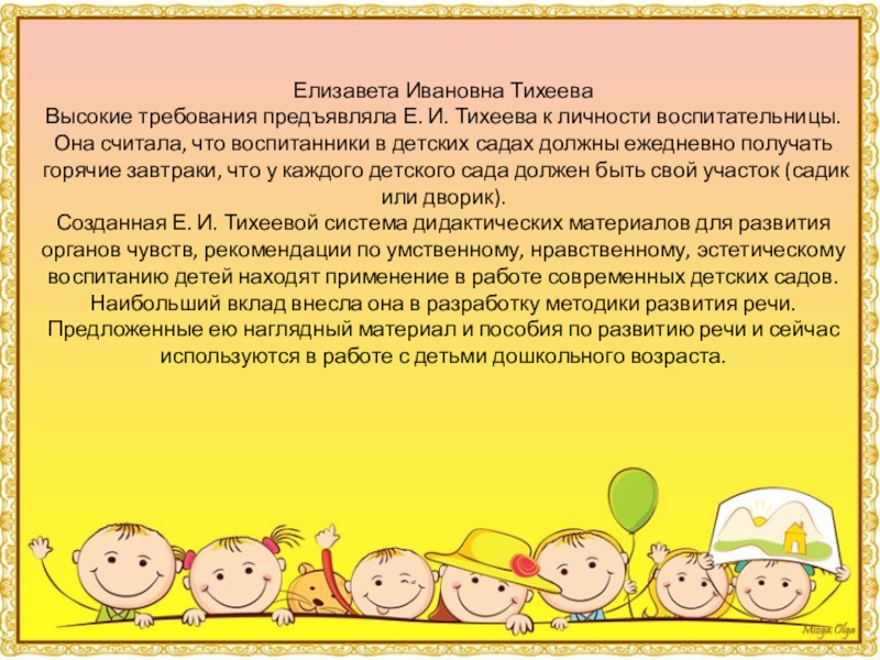 Высокие требования предъявляла Е. И. Тихеева к личности воспитательницы.