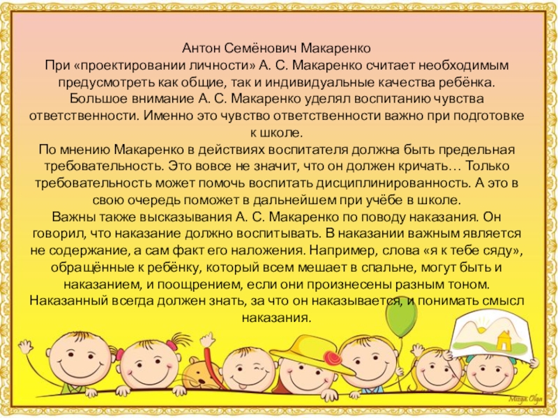 Большое внимание А. С. Макаренко уделял воспитанию чувства ответственности. Именно это чувство ответственности важно при подготовке к школе.