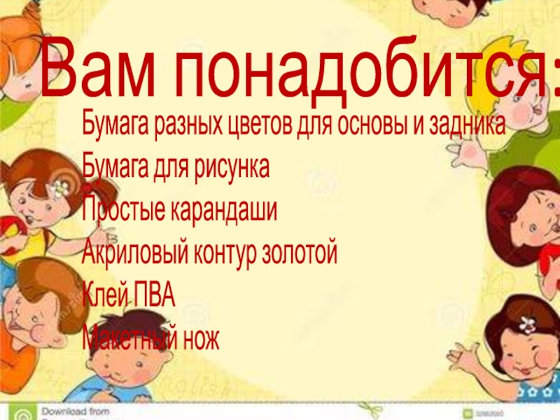 Вам понадобится:Бумага разных цветов для основы и задникаБумага для рисункаПростые карандашиАкриловый контур золотойКлей ПВАМакетный нож