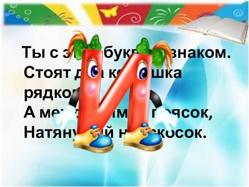 Слайд 8 Ты с этой буквою знаком. Стоят два колышка рядком,