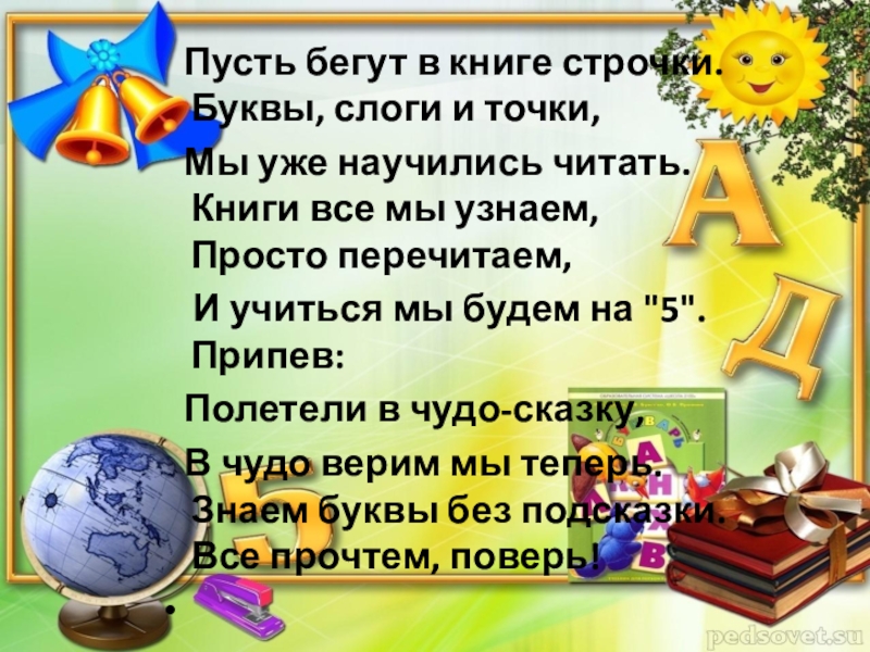 Пусть бегут в книге строчки.  Буквы, слоги и точки,  Мы уже научились читать.