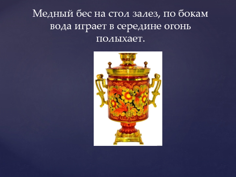Медный бес на стол залез, по бокам вода играет в середине огонь полыхает.