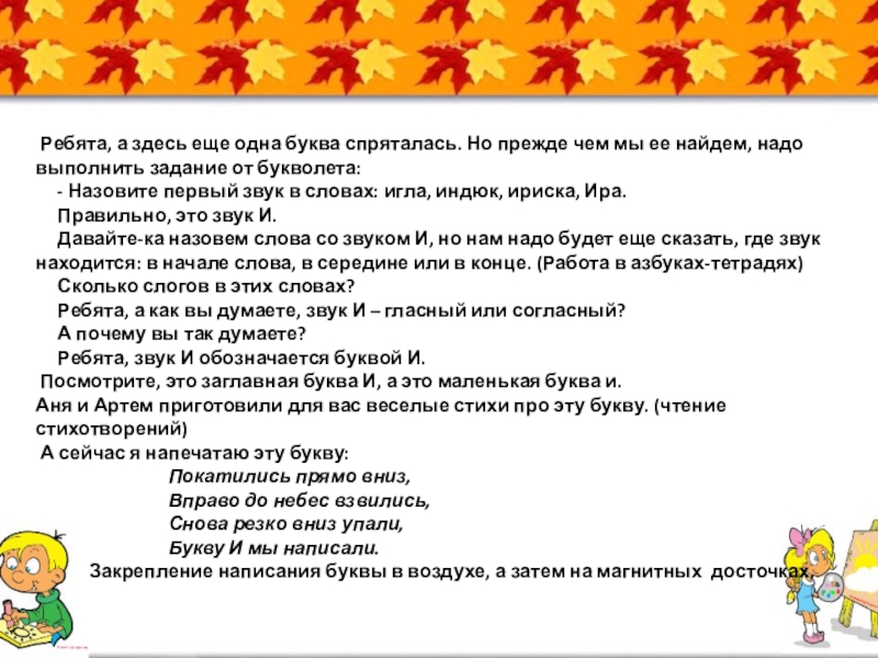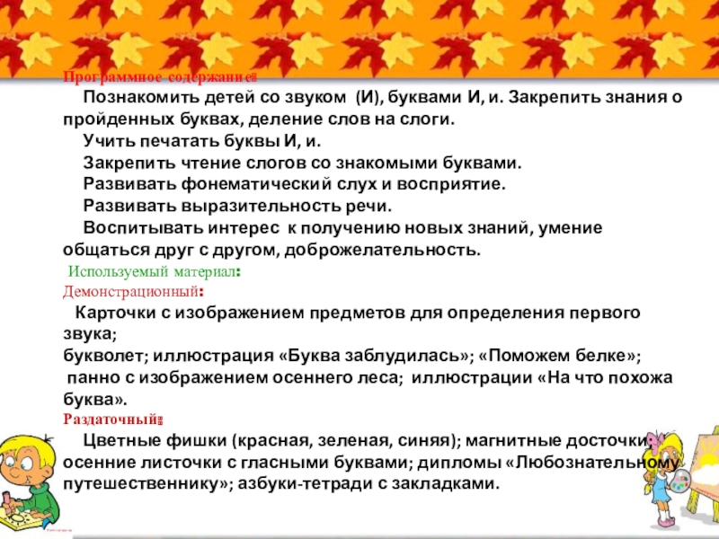 и. Закрепить знания о пройденных буквах, деление слов на слоги.