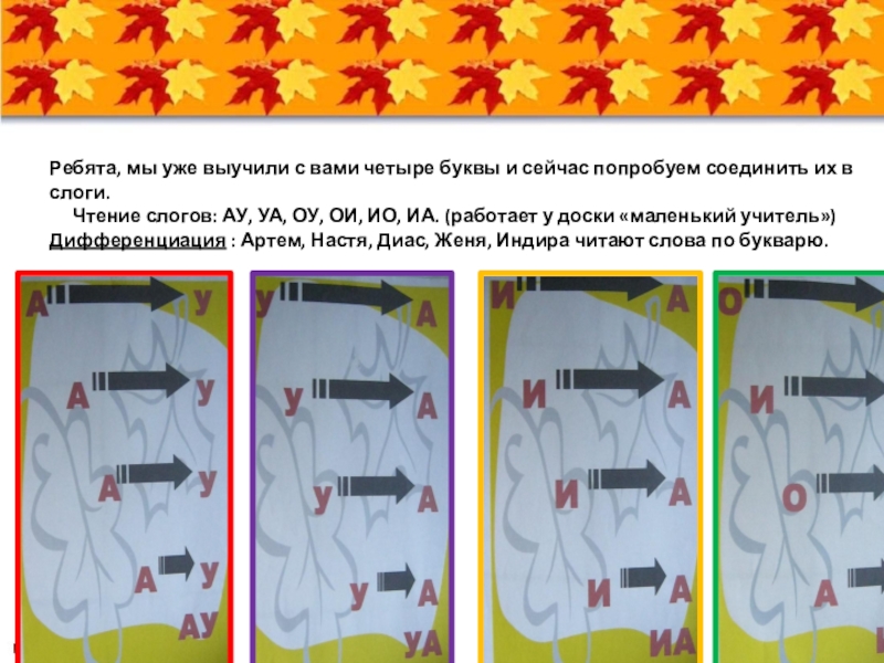 Чтение слогов: АУ, УА, ОУ, ОИ, ИО, ИА. (работает у доски «маленький учитель»)