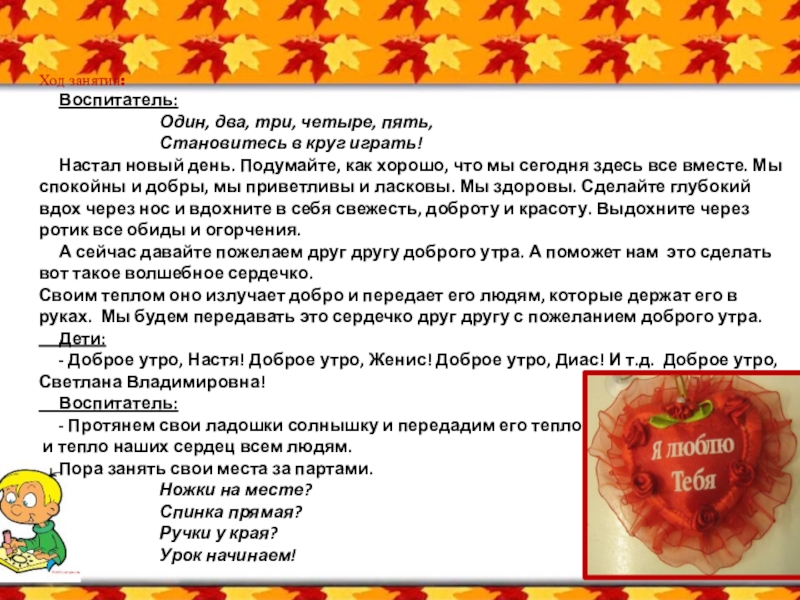 Своим теплом оно излучает добро и передает его людям, которые держат его в руках. Мы будем передавать это сердечко друг другу с пожеланием доброго утра.