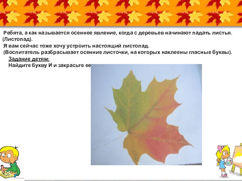 (Воспитатель разбрасывает осенние листочки, на которых наклеены гласные буквы).