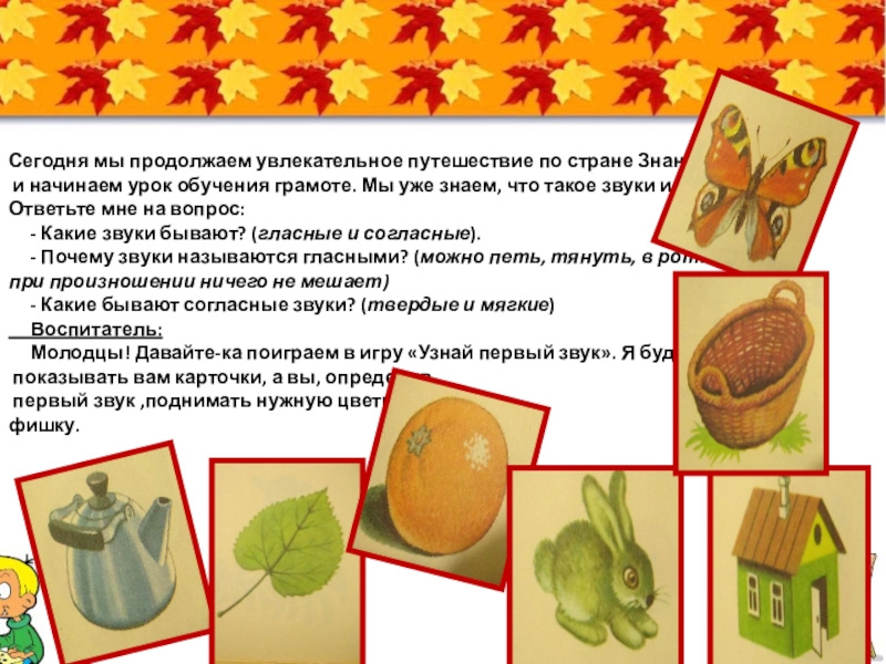 Молодцы! Давайте-ка поиграем в игру «Узнай первый звук». Я буду