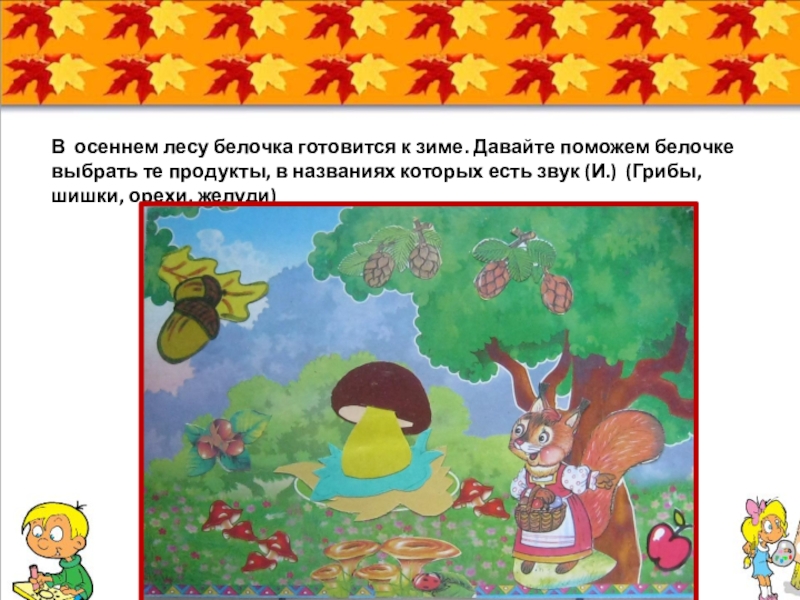 Слайд 11В осеннем лесу белочка готовится к зиме. Давайте поможем белочке выбрать