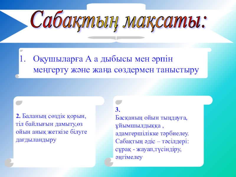 Басқаның ойын тыңдауға,ұйымшылдыққа ,адамгершілікке тәрбиелеу. Сабақтың әдіс – тәсілдері:сұрақ - жауап,түсіндіру,әңгімелеу