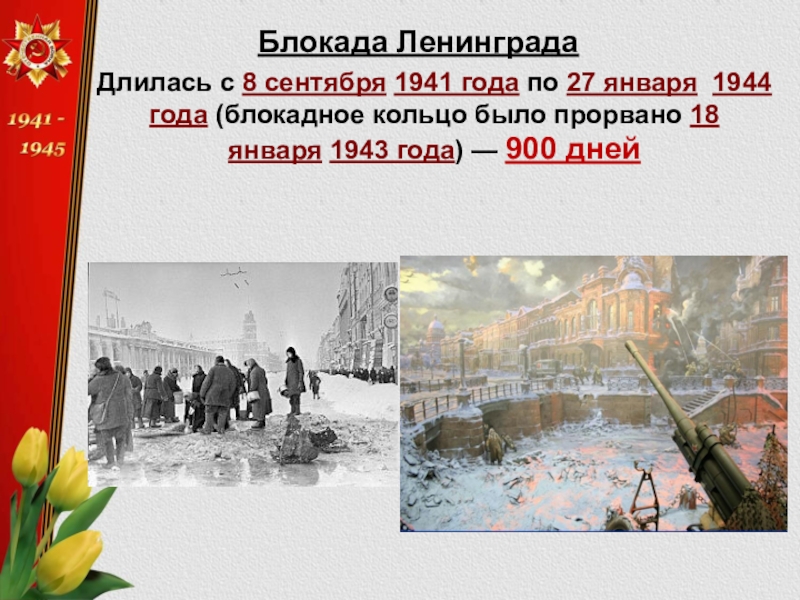 Блокада ЛенинградаДлилась с 8 сентября 1941 года по 27 января  1944 года (блокадное кольцо было прорвано 18 января 1943 года) — 900 дней
