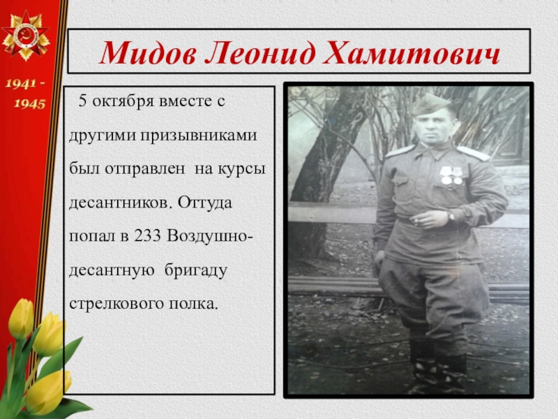 Мидов Леонид Хамитович 5 октября вместе с другими призывниками был отправлен на курсы десантников. Оттуда
