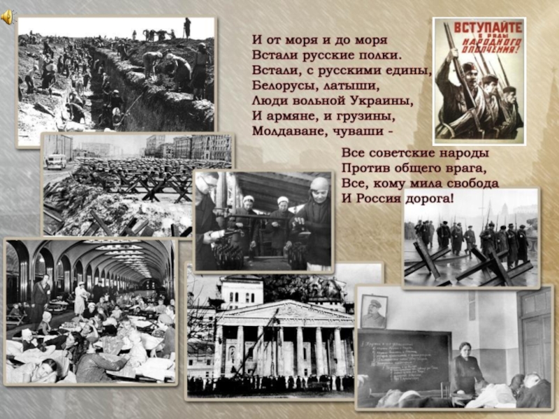 не пришлось, Вы не носили красивых и пышных нарядов. Пулей свинцовою детство от вас унеслось. Дети войны провожали отцов молчаливо, Все понимая – пришел расставания час. От матерей своих прятали слезы стыдливо, Не поднимая печально опущенных глаз. Дети войны на заводах отцов заменили «Все для победы! Для фронта!» - был лозунг один. Жили в цехах, за станками и ели, и пили, Ночи не спали, но верили – мы победим!