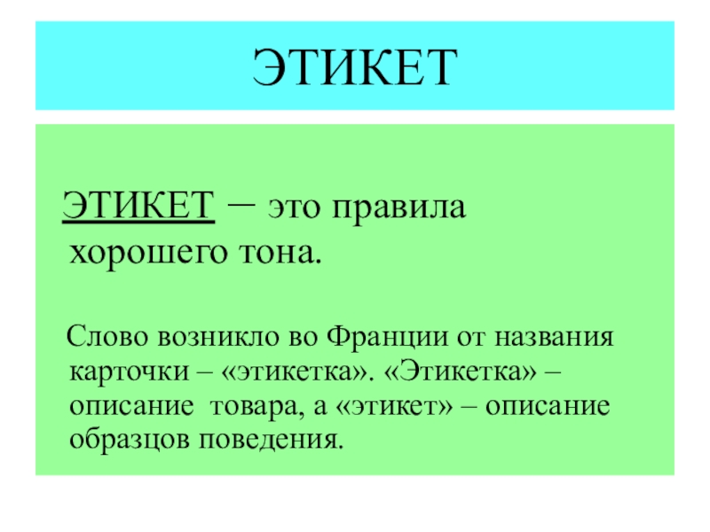 Слово возникло во Франции от названия карточки – «этикетка». «Этикетка» – описание товара, а «этикет» – описание образцов поведения.