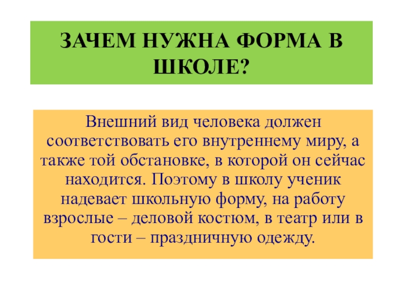 ЗАЧЕМ НУЖНА ФОРМА В ШКОЛЕ? Внешний вид человека должен соответствовать его внутреннему миру, а также той