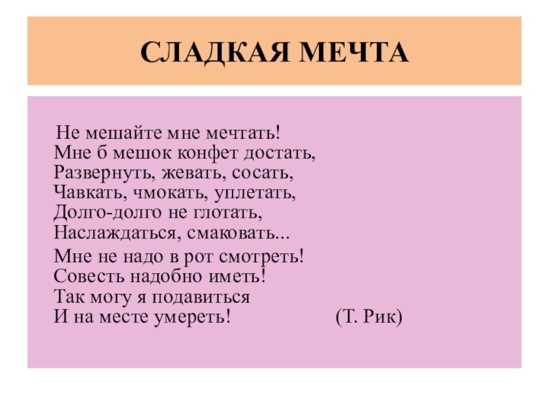 СЛАДКАЯ МЕЧТА Не мешайте мне мечтать! Мне б мешок конфет достать, Развернуть, жевать, сосать, Чавкать, чмокать, уплетать, Долго-долго не глотать, Наслаждаться, смаковать... Мне не надо в рот смотреть!