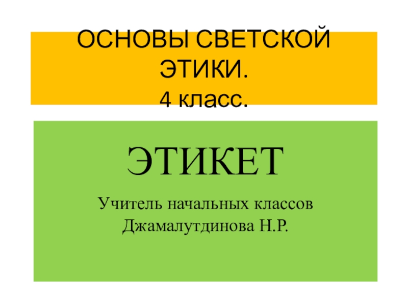 ОСНОВЫ СВЕТСКОЙ ЭТИКИ. 4 класс.ЭТИКЕТ Учитель начальных классов Джамалутдинова Н.Р.