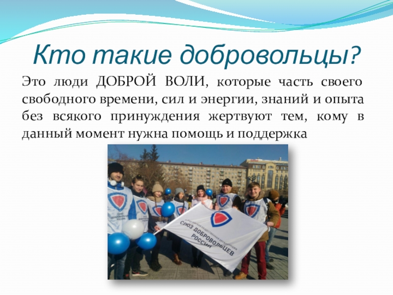 Кто такие добровольцы?Это люди ДОБРОЙ ВОЛИ, которые часть своего свободного времени, сил и энергии, знаний и опыта без всякого принуждения жертвуют тем, кому в данный момент нужна помощь и поддержка