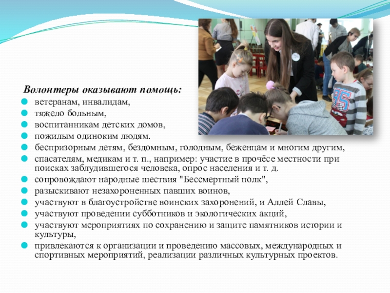 Волонтеры оказывают помощь:ветеранам, инвалидам,тяжело больным, воспитанникам детских домов, пожилым одиноким людям. беспризорным детям, бездомным, голодным, беженцам и
