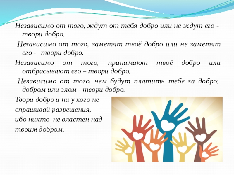 Независимо от того, ждут от тебя добро или не ждут его -  твори добро.  Независимо от того,