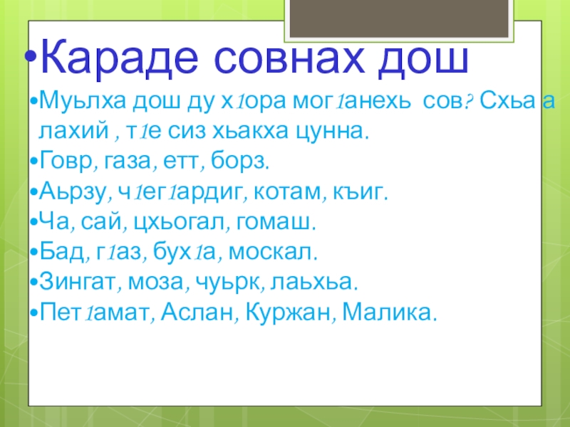 Урокан г1ирс: учебник, ручка, тетрадь, кехаташ, слайдаш.