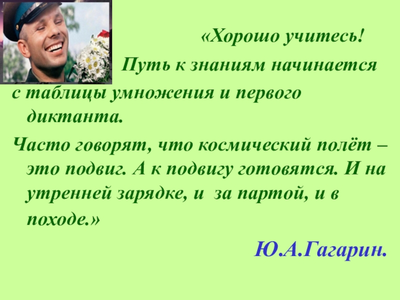 Часто говорят, что космический полёт – это подвиг. А к подвигу готовятся. И на утренней зарядке, и за партой, и в походе.»