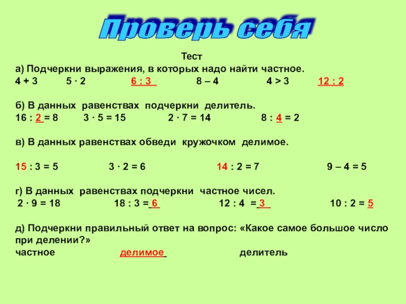 г) В данных равенствах подчеркни частное чисел.