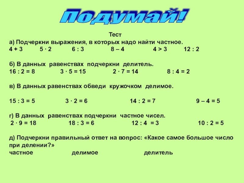 а) Подчеркни выражения, в которых надо найти частное.