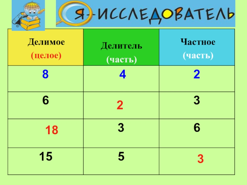 «Открытие» нового знания6 :  2  =  3делитель  делимоечастноечастное6:2=3