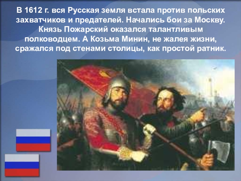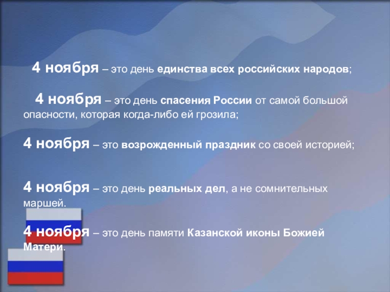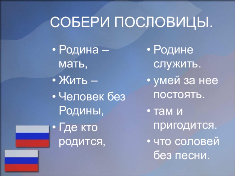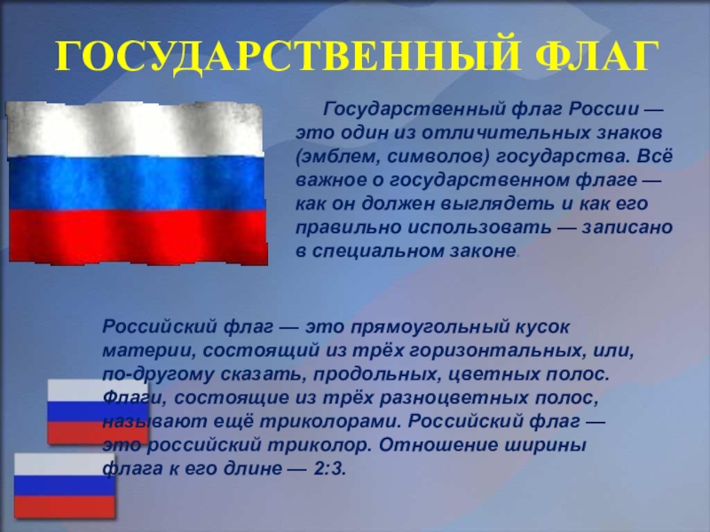 Российский флаг — это прямоугольный кусок материи, состоящий из трёх горизонтальных, или, по-другому сказать, продольных, цветных полос. Флаги, состоящие из трёх разноцветных полос, называют ещё триколорами. Российский флаг — это российский триколор. Отношение ширины флага к его длине — 2:3.