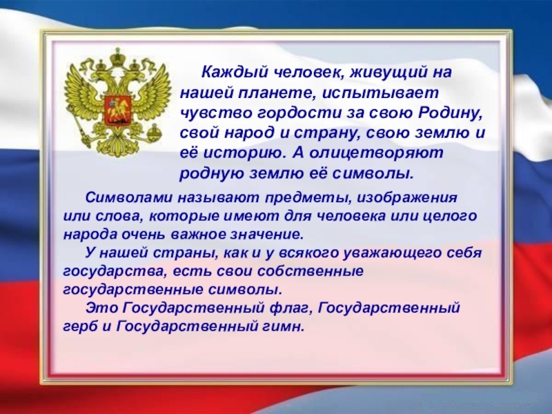 Символами называют предметы, изображения или слова, которые имеют для человека или целого народа очень важное значение.