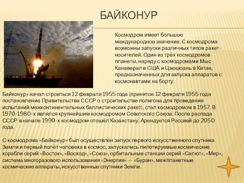Байконур» начал строиться 12 февраля 1955 года (принятое 12 февраля 1955 года постановление Правительства СССР о строительстве полигона для проведения испытаний межконтинентальных баллистических ракет), стал космодромом в 1957. В 1970-1980-х являлся крупнейшим космодромом Советского Союза. После распада СССР в начале 1990-х космодром отошёл Казахстану. Арендуется Россией до 2050 года.