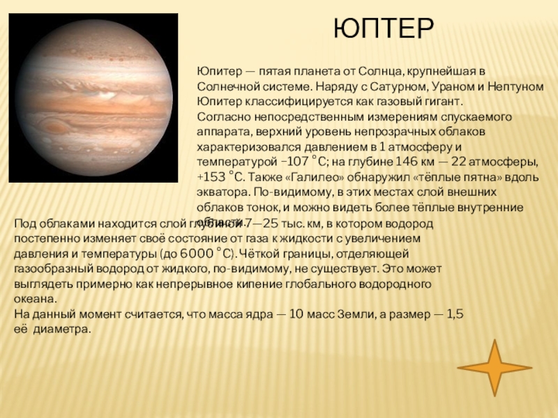 Под облаками находится слой глубиной 7—25 тыс. км, в котором водород постепенно изменяет своё состояние от газа к жидкости с увеличением давления и температуры (до 6000 °C). Чёткой границы, отделяющей газообразный водород от жидкого, по-видимому, не существует. Это может выглядеть примерно как непрерывное кипение глобального водородного океана.
