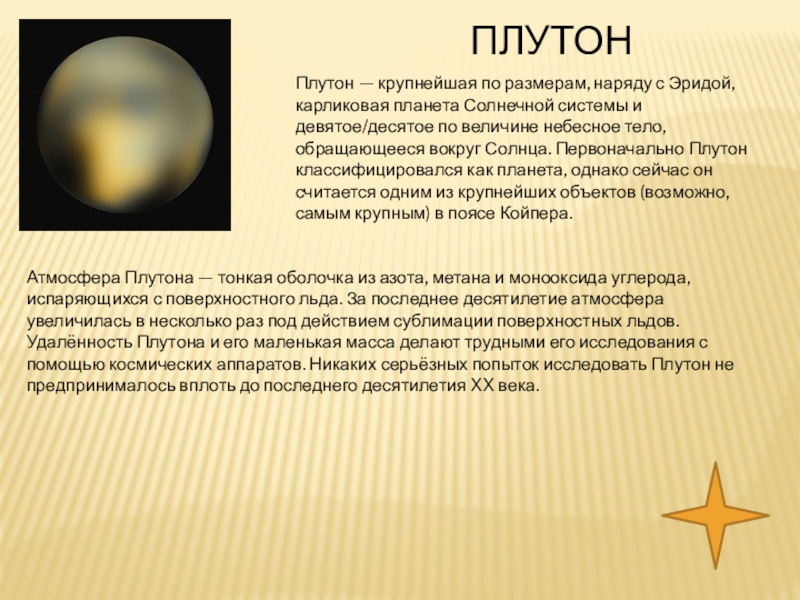 Атмосфера Плутона — тонкая оболочка из азота, метана и монооксида углерода, испаряющихся с поверхностного льда. За последнее десятилетие атмосфера увеличилась в несколько раз под действием сублимации поверхностных льдов. Удалённость Плутона и его маленькая масса делают трудными его исследования с помощью космических аппаратов. Никаких серьёзных попыток исследовать Плутон не предпринималось вплоть до последнего десятилетия XX века.