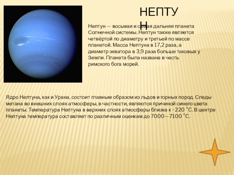 Ядро Нептуна, как и Урана, состоит главным образом из льдов и горных пород. Следы метана во внешних слоях атмосферы, в частности, являются причиной синего цвета планеты. Температура Нептуна в верхних слоях атмосферы близка к −220 °C. В центре Нептуна температура составляет по различным оценкам до 7000—7100 °C.
