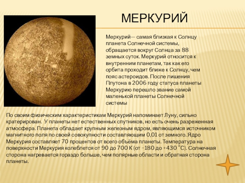 По своим физическим характеристикам Меркурий напоминает Луну, сильно кратерирован. У планеты нет естественных спутников, но есть очень разреженная атмосфера. Планета обладает крупным железным ядром, являющимся источником магнитного поля по своей совокупности составляющим 0,01 от земного. Ядро Меркурия составляет 70 процентов от всего объёма планеты. Температура на поверхности Меркурия колеблется от 90 до 700 К (от −180 до +430 °C). Солнечная сторона нагревается гораздо больше, чем полярные области и обратная сторона планеты.