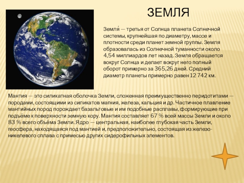 Мантия — это силикатная оболочка Земли, сложенная преимущественно перидотитами — породами, состоящими из силикатов магния, железа, кальция и др. Частичное плавление мантийных пород порождает базальтовые и им подобные расплавы, формирующие при подъёме к поверхности земную кору. Мантия составляет 67 % всей массы Земли и около 83 % всего объёма Земли. Ядро — центральная, наиболее глубокая часть Земли, геосфера, находящаяся под мантией и, предположительно, состоящая из железо-никелевого сплава с примесью других сидерофильных элементов.