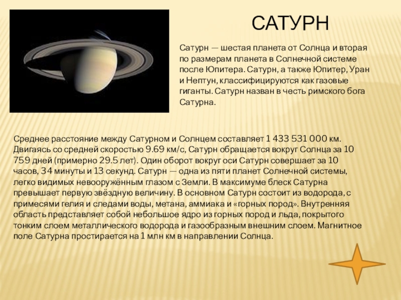 Среднее расстояние между Сатурном и Солнцем составляет 1 433 531 000 км. Двигаясь со средней скоростью 9.69 км/с, Сатурн обращается вокруг Солнца за 10 759 дней (примерно 29.5 лет). Один оборот вокруг оси Сатурн совершает за 10 часов, 34 минуты и 13 секунд. Сатурн — одна из пяти планет Солнечной системы, легко видимых невооружённым глазом с Земли. В максимуме блеск Сатурна превышает первую звёздную величину. В основном Сатурн состоит из водорода, с примесями гелия и следами воды, метана, аммиака и «горных пород». Внутренняя область представляет собой небольшое ядро из горных пород и льда, покрытого тонким слоем металлического водорода и газообразным внешним слоем. Магнитное поле Сатурна простирается на 1 млн км в направлении Солнца.