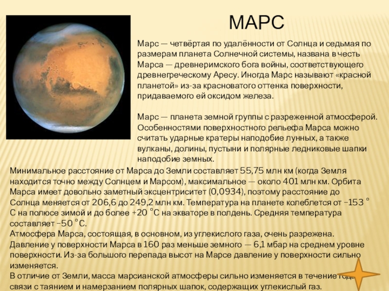 Минимальное расстояние от Марса до Земли составляет 55,75 млн км (когда Земля находится точно между Солнцем и Марсом), максимальное — около 401 млн км. Орбита Марса имеет довольно заметный эксцентриситет (0,0934), поэтому расстояние до Солнца меняется от 206,6 до 249,2 млн км. Температура на планете колеблется от −153 °C на полюсе зимой и до более +20 °C на экваторе в полдень. Средняя температура составляет −50 °C.