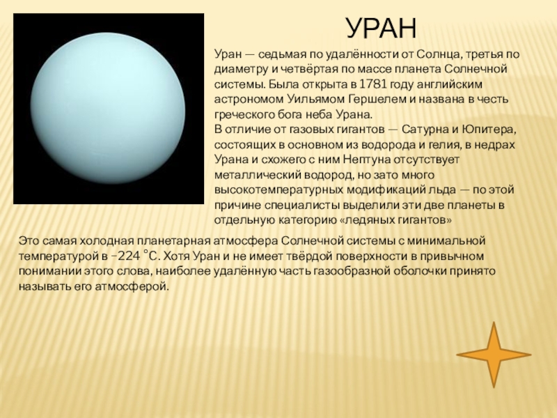 Это самая холодная планетарная атмосфера Солнечной системы с минимальной температурой в −224 °C. Хотя Уран и не имеет твёрдой поверхности в привычном понимании этого слова, наиболее удалённую часть газообразной оболочки принято называть его атмосферой.