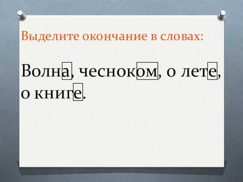 Слайд 9Выделите окончание в словах: Волна, чесноком, о лете, о книге.