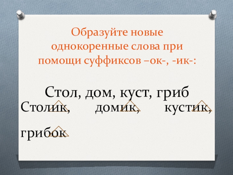 Образуйте новые однокоренные слова при помощи суффиксов –ок-, -ик-:  Стол, дом, куст, грибСтолик, домик, кустик, грибок