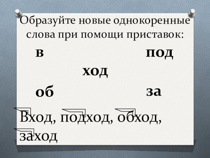Образуйте новые однокоренные слова при помощи приставок:ходзаобподвВход, подход, обход, заход