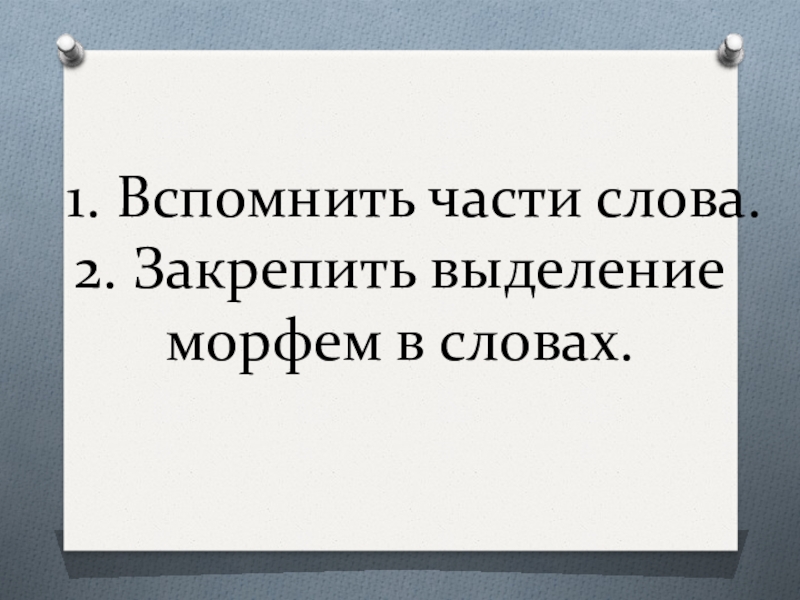 Слайд 6 1. Вспомнить части слова. 2. Закрепить выделение морфем в словах.