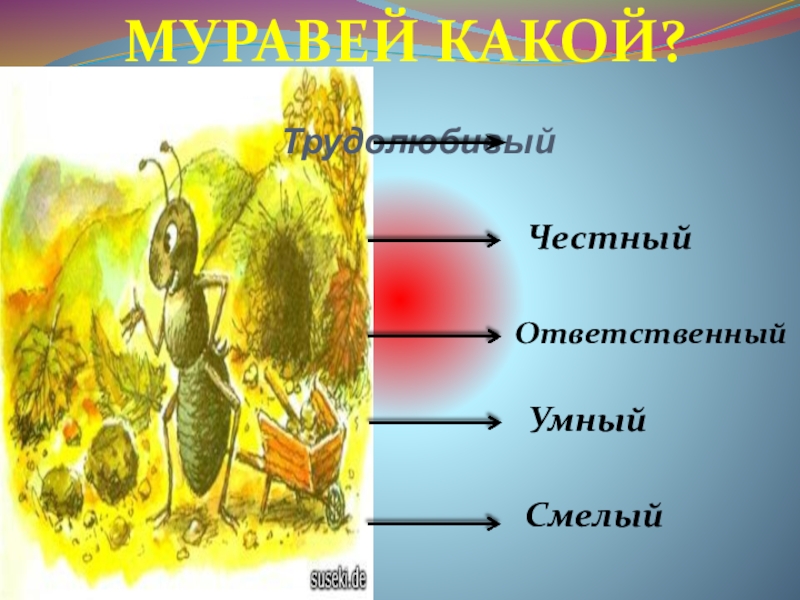 ТрудолюбивыйМуравей какой?ЧестныйОтветственныйУмныйСмелый