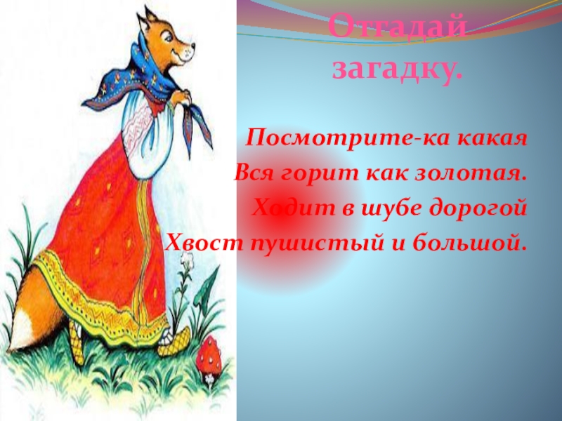 Посмотрите-ка какаяВся горит как золотая.Ходит в шубе дорогойХвост пушистый и большой.Отгадай загадку.