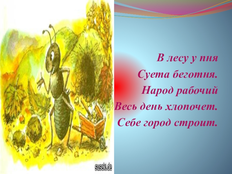 В лесу у пняСуета беготня.Народ рабочийВесь день хлопочет.Себе город строит.