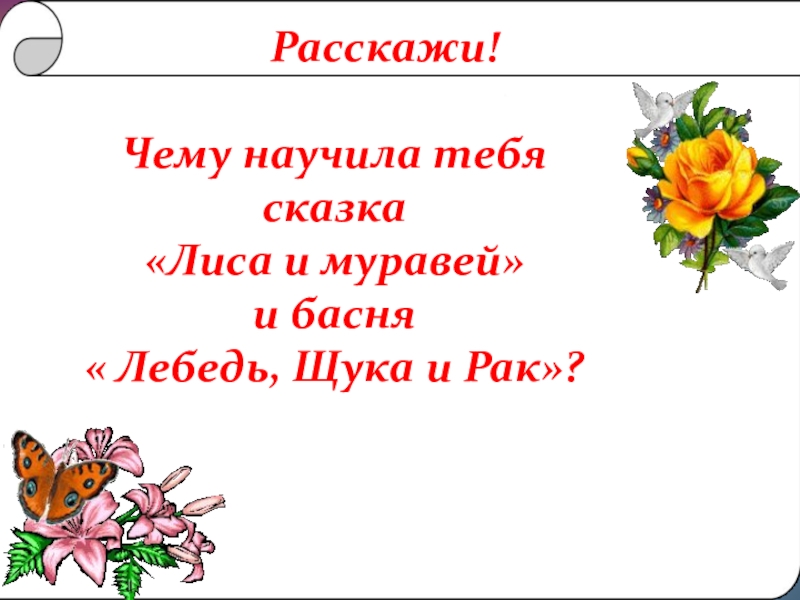 Расскажи!Чему научила тебя сказка«Лиса и муравей» и басня « Лебедь, Щука и