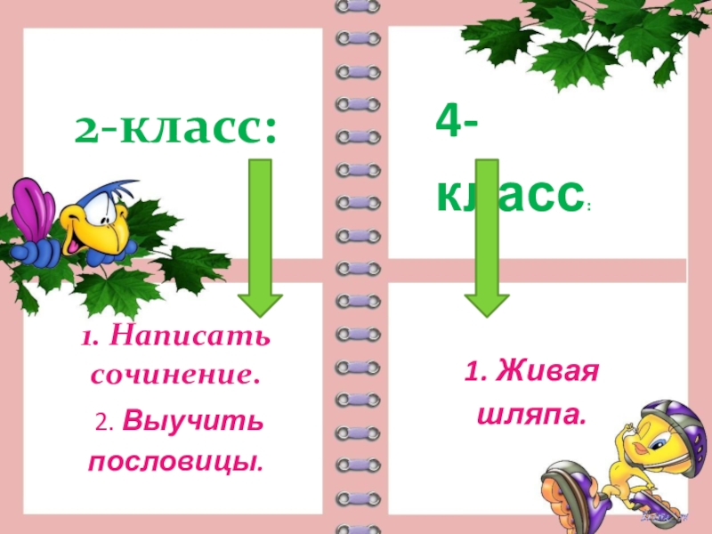 2-класс:1. Написать сочинение. 2. Выучить пословицы.4-класс:1. Живая шляпа.